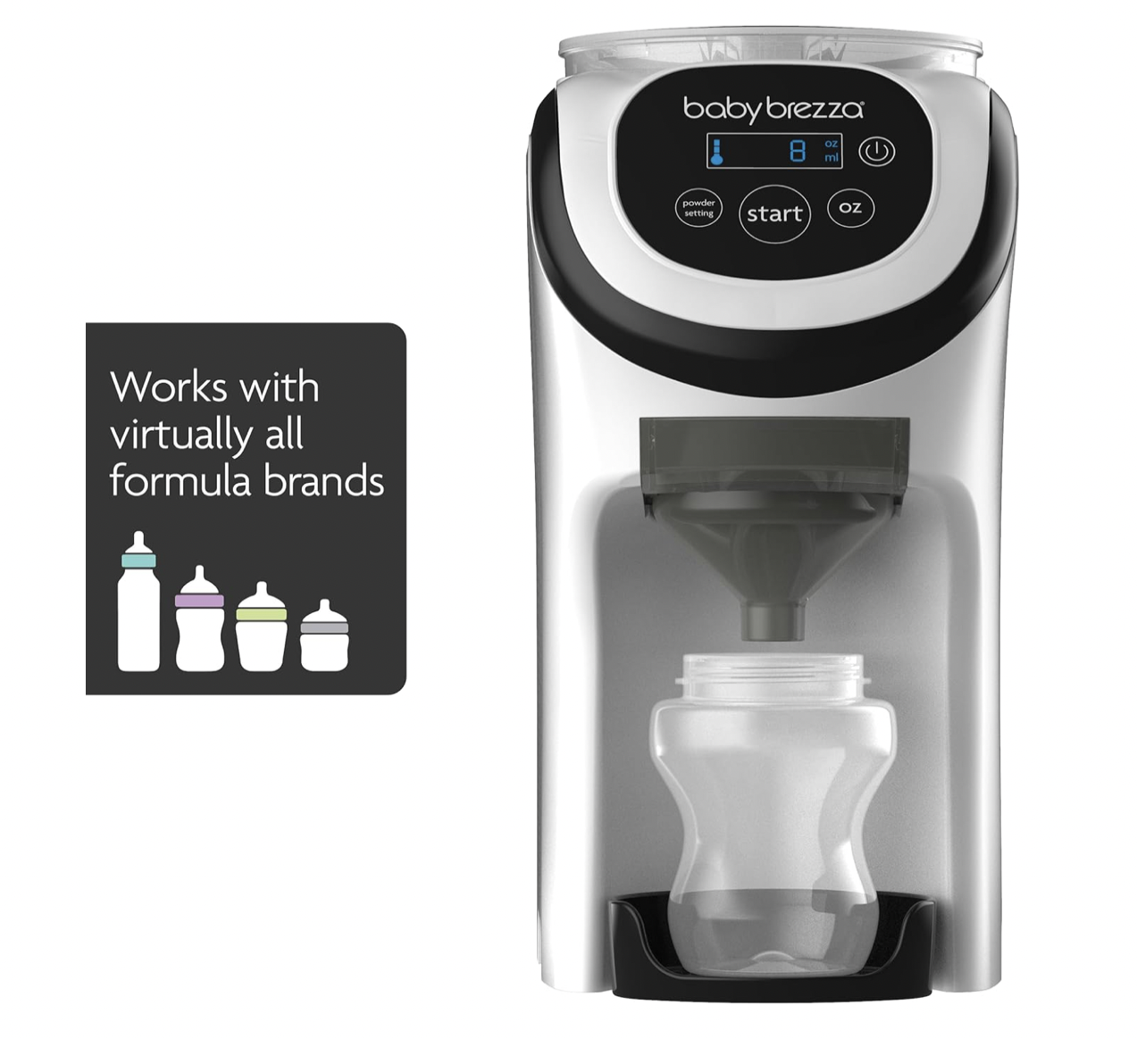 - Works with virtually all formula brands and all brands/types of bottles (tall bottles typically over 9oz require a stand sold separately)