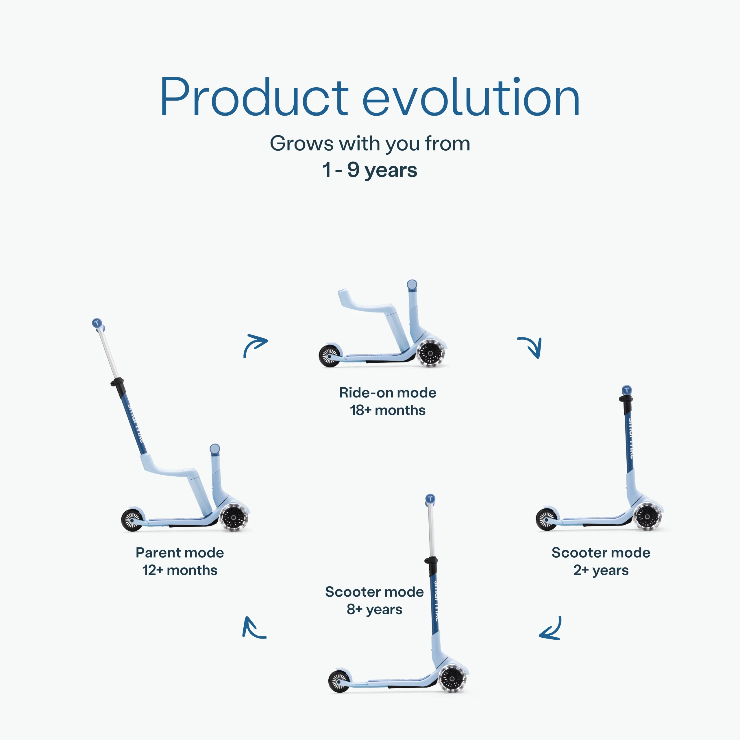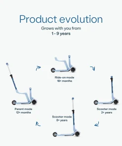 The smarTrike Xtend Mini Ride-on is a multifunctional scooter designed for children aged 12 months to 9 years. It easily transforms to adapt to your child’s growth and developmental stages.