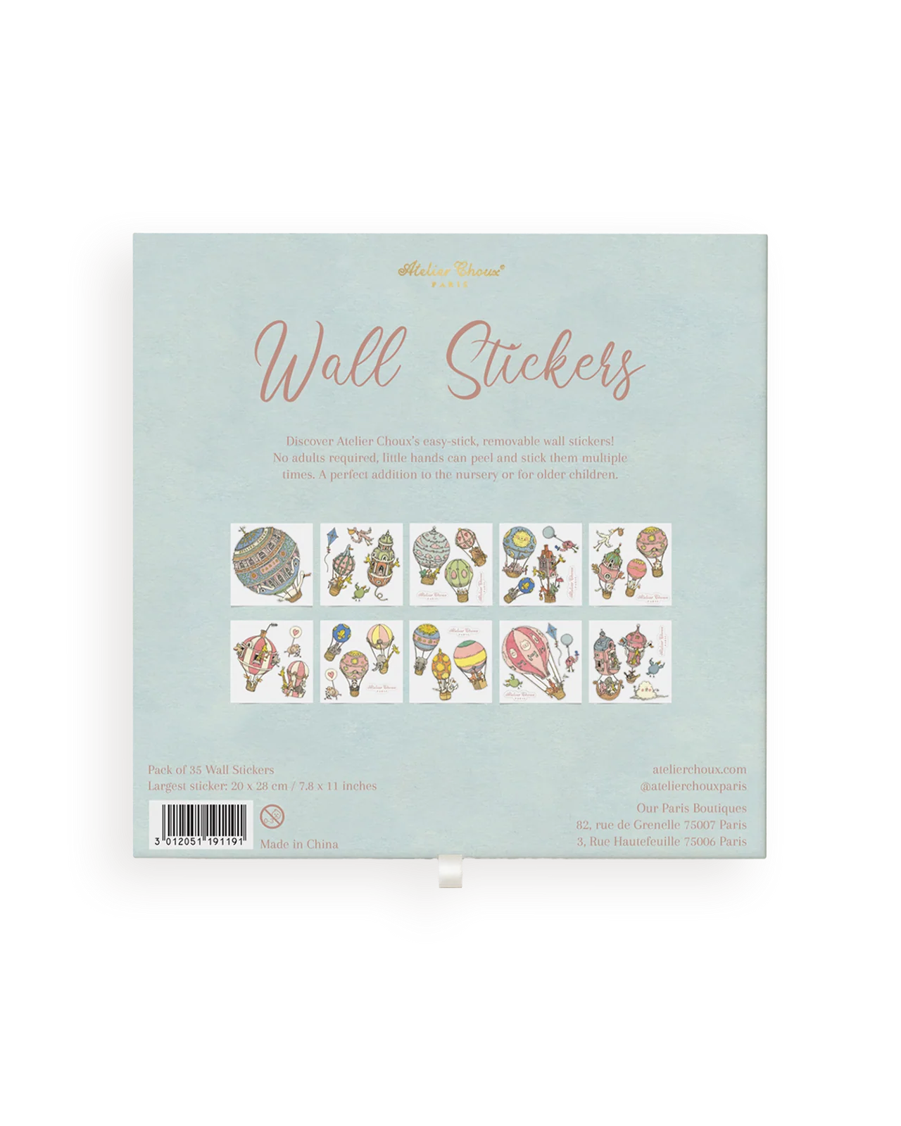 - Atelier Choux-ի պատի պիտակները խաղային ու էլեգանտ լրացում են ցանկացած մանկասենյակի, լոգասենյակի կամ խաղասենյակի համար: Ներկված փոքրիկ ձեռքերի համար՝ այս պիտակները հեշտ է տեղադրել և տեղափոխել՝ առանց մեծահասակների օգնության