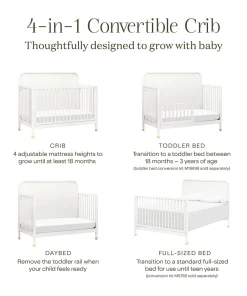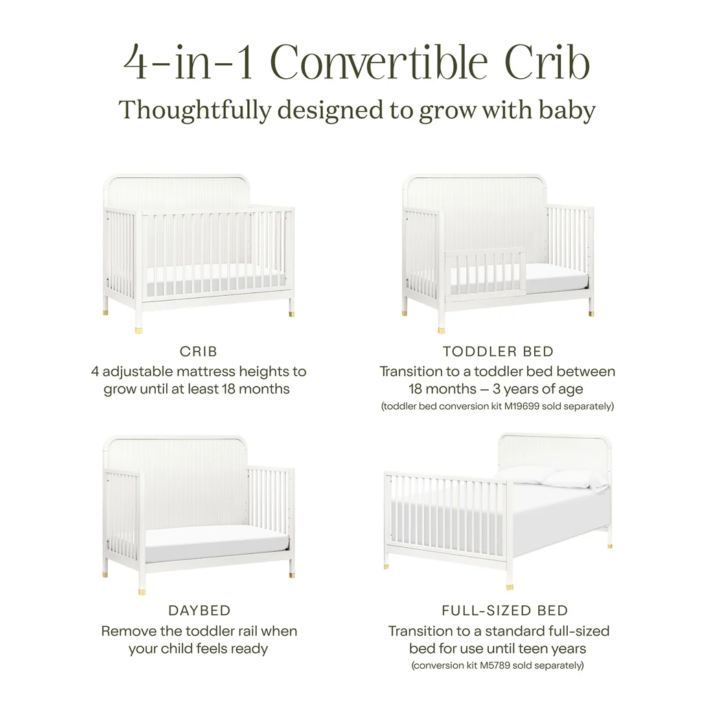 4-ը 1-ում Փոխարկելիություն: Հեշտությամբ փոխարկվում է մանկական մահճակալից փոքրիկի մահճակալի, բազմոցի և լիարժեք չափսի մահճակալի: (Փոքրիկի մահճակալի փոխարկման հավաքածուն և լիարժեք չափսի մահճակալի փոխարկման հավաքածուն վաճառվում են առանձին:)